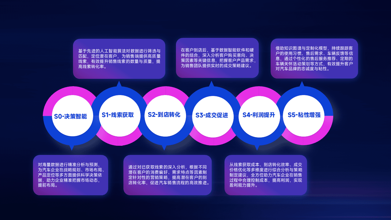 基于销售转化漏斗的薄弱环节,,,为客户提供数据+模型+运营的智能应用,,,实现销售业绩的提升;推动线索管理全链路的精细化管理和运营。。。。